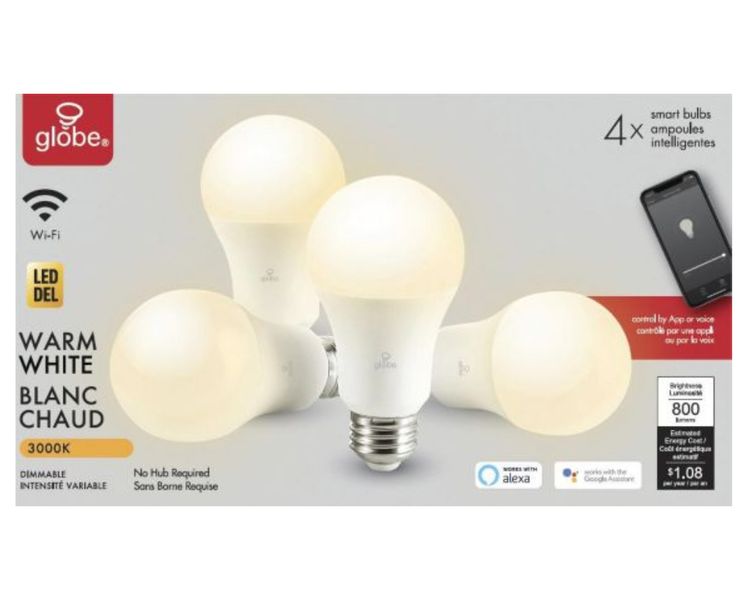 Globe A19 Dimmable Wi-Fi LED Smart Bulb is easily controlled by the Globe Suite app and works with Google Assistant or Amazon Alexa Canadian Tire.